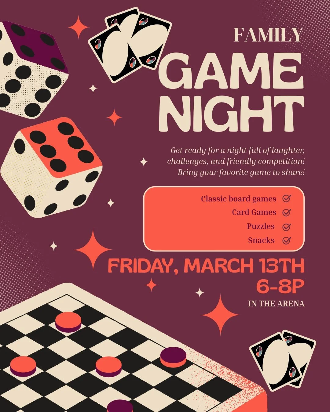 A simple, fun night to laugh, play games, and spend time together. Bring a favorite game if you’d like, or just come ready to jump in. We can’t wait to see you there!